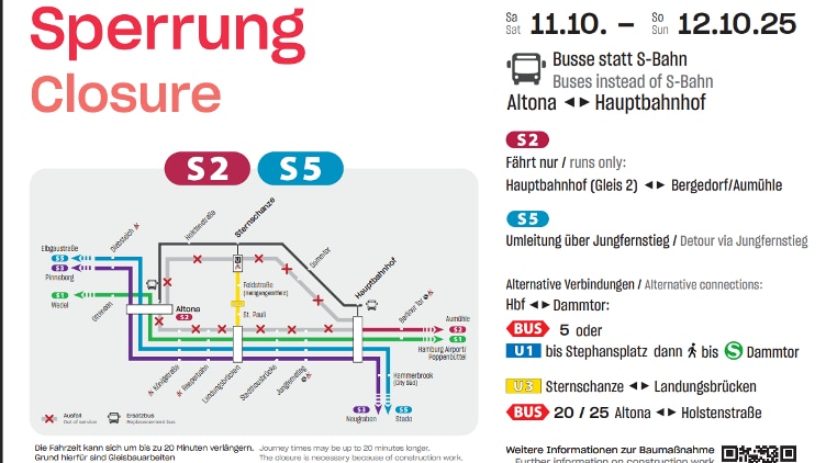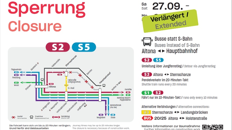 Dadurch verlängert sich die Baustelle und der Streckenabschnitt zwischen Hauptbahnhof und Sternschanze bleibt weiterhin gesperrt. Voraussichtlich am Freitagmorgen, den 10. Oktober 2025, kann er wieder für den S-Bahn-Verkehr freigegeben werden.