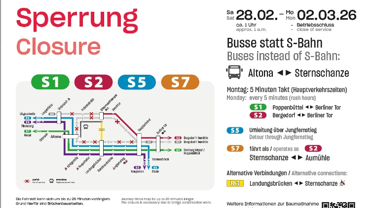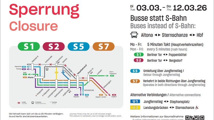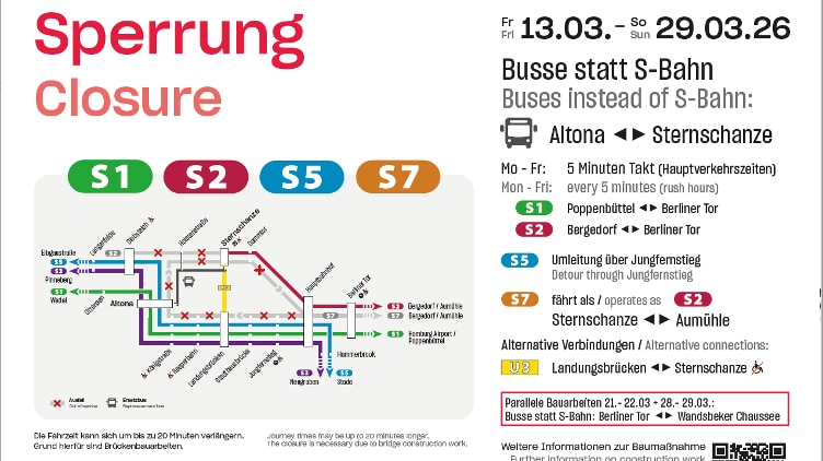 Im März treibt die DB InfraGO die Arbeiten an mehreren Eisenbahnbrücken in Hamburg voran. Ein Teil der Bauarbeiten fällt in die Hamburger Skiferien. Für die Bautätigkeiten werden einige Streckenabschnitte gesperrt. Wir sagen euch, wie die einzelnen Linien fahren und was eure Alternativen sind.