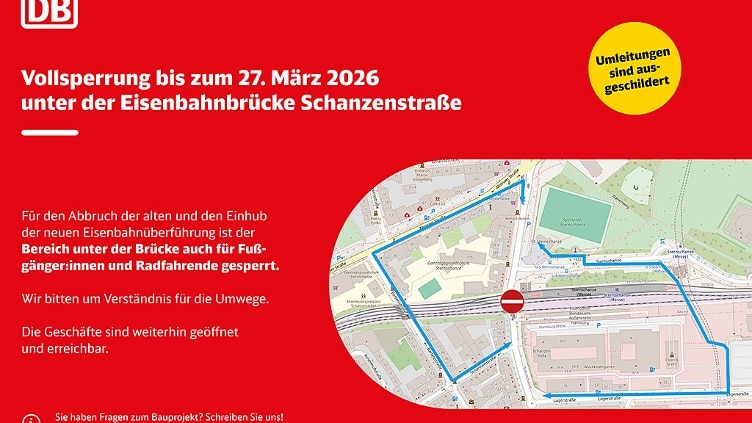 Seit 28. Februar fahren wegen Brückenbauarbeiten im Hamburger Stadtgebiet keine S-Bahnen auf der Verbindungsbahn (Dammtor-Strecke). Nun steht der letzte Abschnitt der Sperrpause im März an: Von Freitag, 13. März bis Sonntag, 29. März fahren zwischen Altona und Sternschanze Busse statt S-Bahnen.