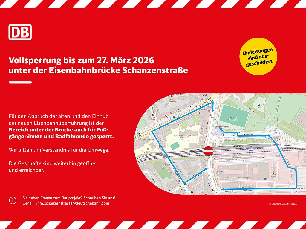 Der Bereich unter der Brücke Schanzenstraße ist weiterhin für Fußgänger:innen und Radfahrende gesperrt. Wer von der Station Richtung Schanze will, muss einen Umweg gehen. Wegeskizzen findet Ihr als Aushang am Bahnhof.